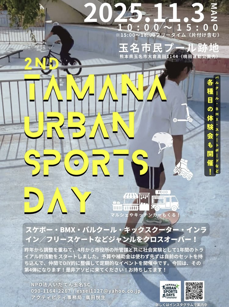NPO法人いだてん玉名SCが市(スポーツ振興課)と連携し、市民プール跡地を活用した社会実験として、スケートボードやBMX、パルクールなどアーバンスポーツを実施しています。