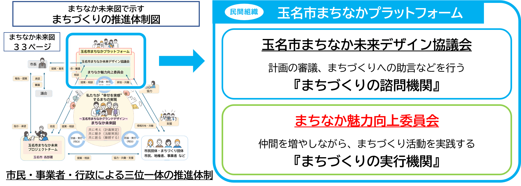 まちなかの活性化は行政の力だけで行うことはできません。まちが持続的に発展し続けるためには、市民や事業者などの民間の皆さまがまちづくりに参画し、公と民が連携して取り組んでいくことが重要です。