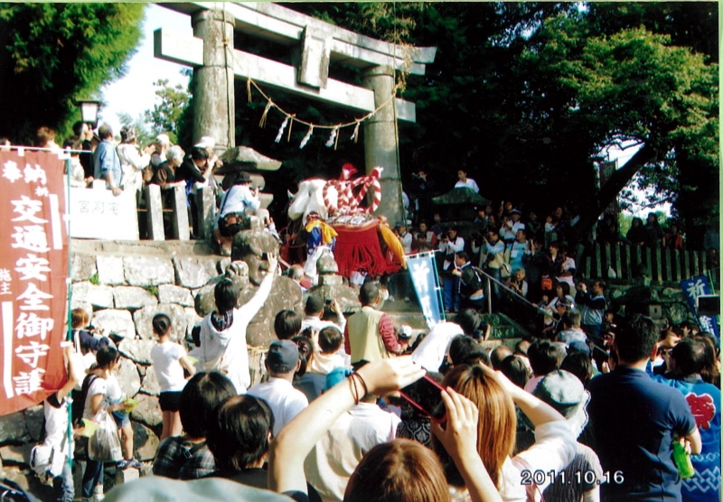 平成28年の繁根木八幡宮の節頭は高道上区が務めました。大人も子供もみんなで送り出す1コマは、つながりの強い高道らしい光景です。 | 高道上区公民館(節頭) |