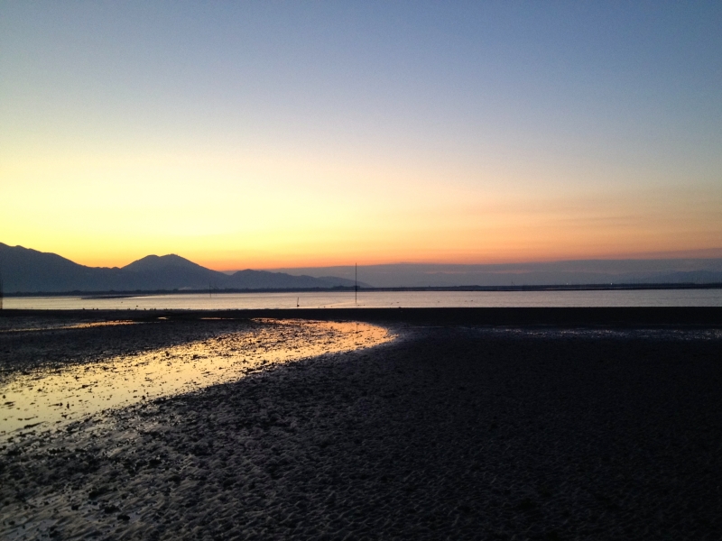 真冬早朝の干潟の眺望景観です。朝焼けを背景に金峰山が見えます。有明海の沖にはたくさんの海苔ひびと、さらにその奥にはぼんやりとした宇土半島が確認できます。この眺望を見たことがあるのは、寒さを我慢できる漁師か釣師くらいでしょう。 | 菊池川河口干潟 |