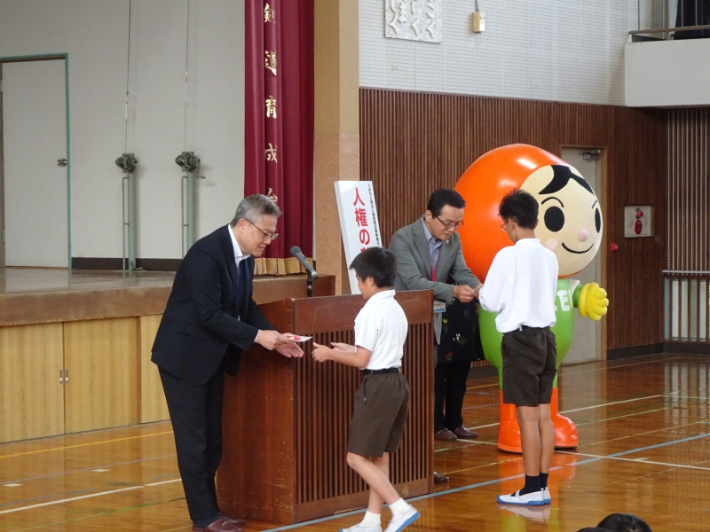 次に、熊本地方法務局玉名支局長、玉名人権擁護委員協議会会長から代表して2人の児童に記念品が贈られました。記念品は、後日、児童全員に配布されます。
