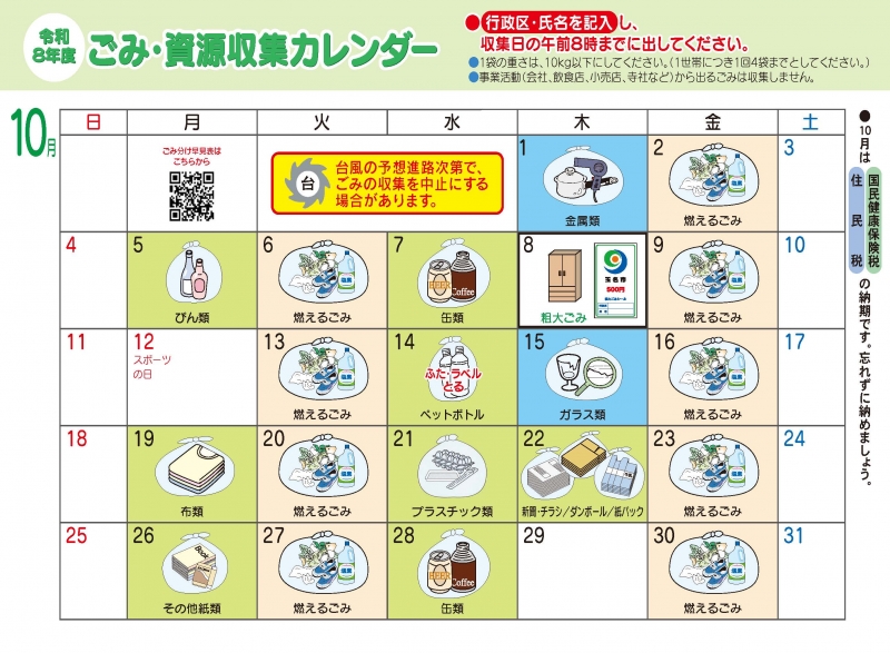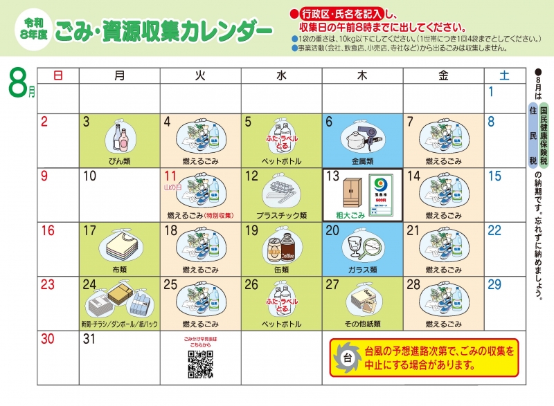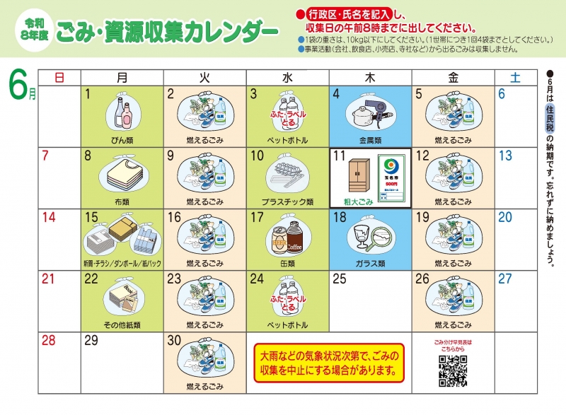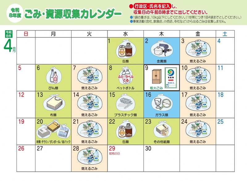 令和8年度ごみ資源収集カレンダー(6ヶ月毎)(PDF 約2MB)