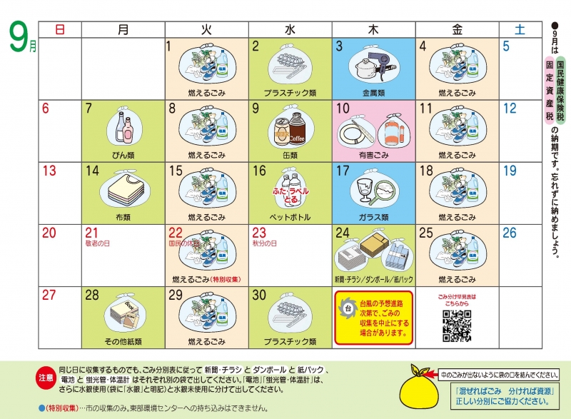 - 同じ日に収集するものでも、ごみ分別表に従ってダンボールと紙パック、電池と蛍光管・体温計はそれぞれ別の袋で出してください。
