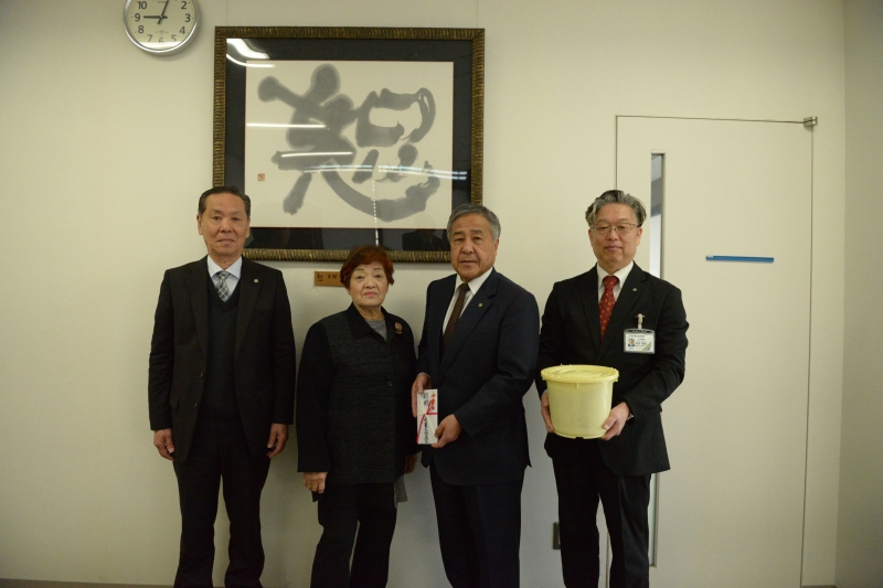 令和8年1月27日、JAたまな女性部より、玉名市内小中学校の給食用として、手作りみそ82キログラムが贈呈されました。