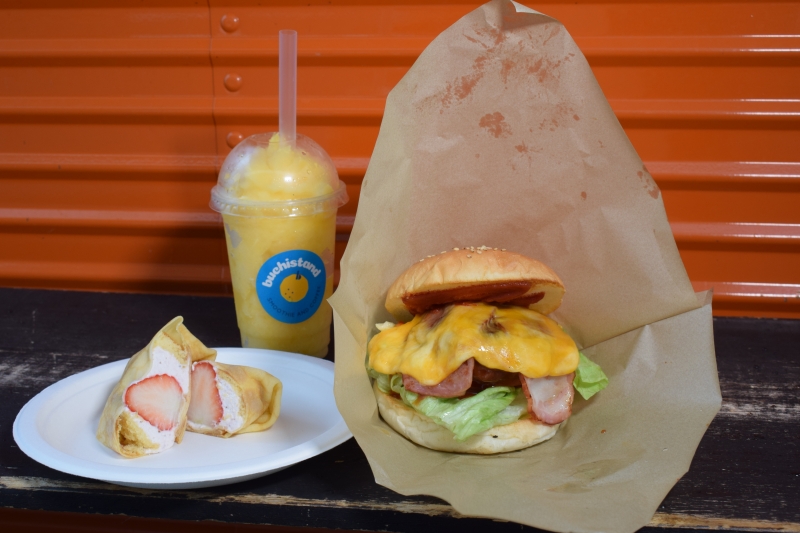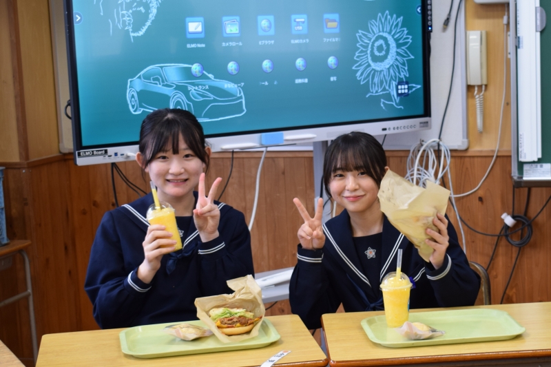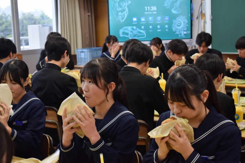 県北地域で活躍するキッチンカー「たっくんバーガー」と「ぶちスタンド」、天水出身のパティシエが経営する「洋菓子の山岡」が、天水産のトマトを使用したハンバーガー、みかんのスムージー、いちごのクレープを卒業生に提供し、エールを送りました。この3者は、令和5年度から天水地域の過疎脱却に向けたミーティングに参加し、賑わい創出にも協力しています。