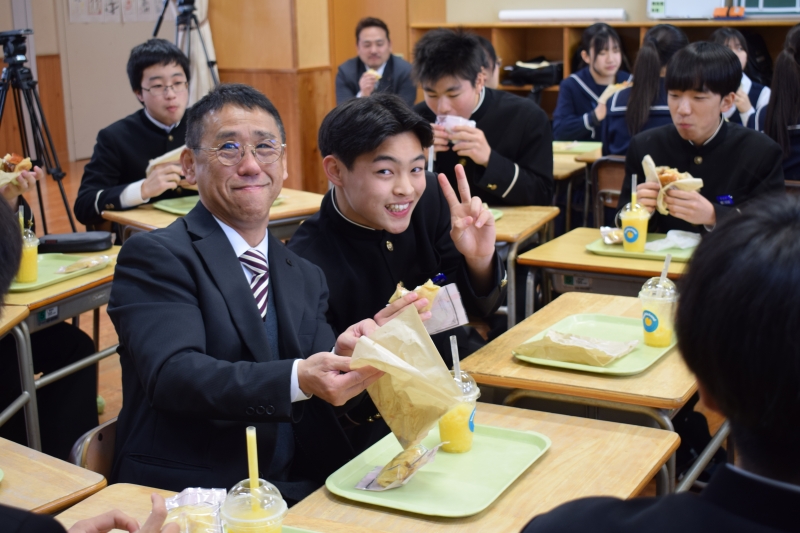 卒業式前日の令和8年3月6日、天水中学校で天水地区の企業・団体、農家などの有志が協力して、卒業記念イベント「ごほうび給食」を実施しました。