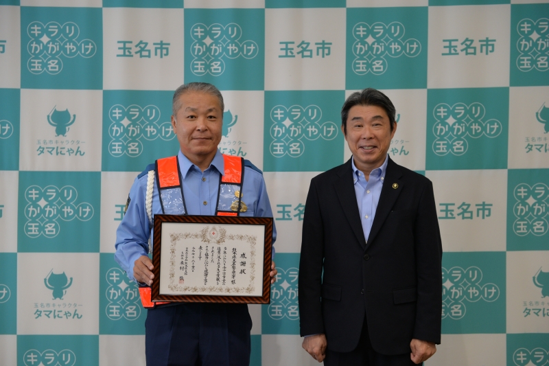 献血功労団体への感謝状伝達式が9月19日に市役所で行われ、日本赤十字社熊本県支部長感謝状(金枠)を受章した玉名警察署に藏原市長が感謝状を伝達しました。