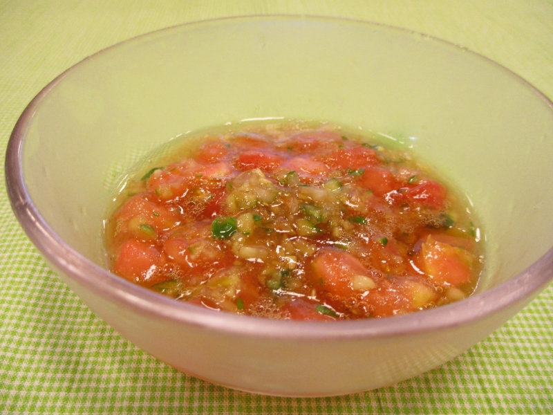 | トマト | 小1個(100g) | 1)トマトは皮を湯むきし、1センチ角に切る。 玉ねぎ、きゅうりはみじん切りし軽く塩をして、 冷やし固める。