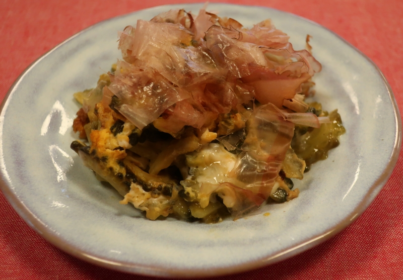 | にがうり | 2/3本(150g) | 1)にがうりは縦に2つに割りスプーンで白い部分を取り 3〜4ミリの厚さに切りサッと茹でる。 4)器に盛り、かつお節をかける。