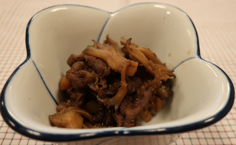 | まいたけ | 1と1/2パック(150g) | 1)まいたけは汚れをふき取り、手で裂く。 生姜は洗い、皮ごとすりおろす。 1)と牛肉を中火で煮る。