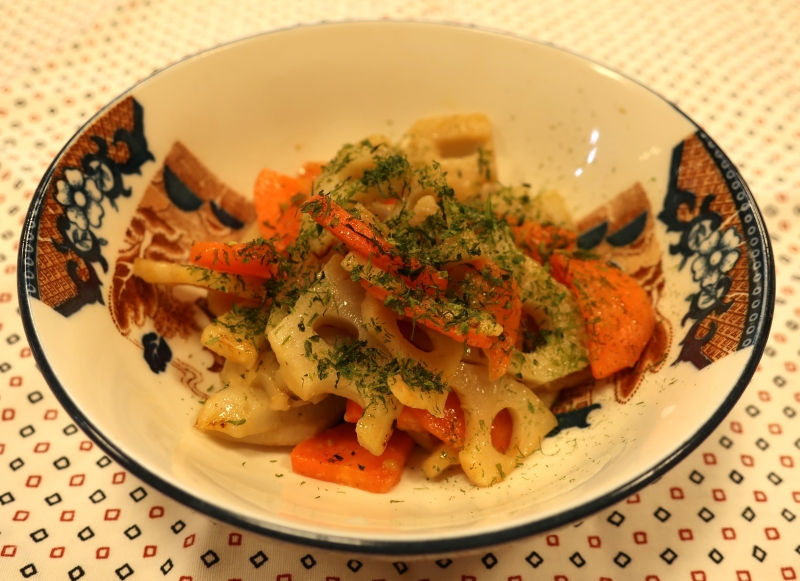 | 人参 | 1/3本(50g) | 1)人参とれんこんは、薄いいちょう切りにする。 2)フライパンにサラダ油を熱し、1)を加え、さっと炒める。