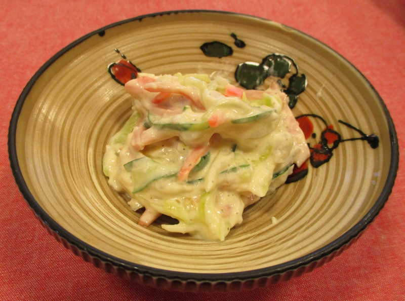 | 里芋 | 中サイズ2個(80g) | 1)里芋は皮をむき、一口大の大きさに切って茹で、冷ます。 きゅうり、玉ねぎ、人参はせん切りにして塩(塩もみ用) を加え、よくもみ、水洗いして水気を絞る。 1)を加え混ぜ合わせる。(お好みでつぶしながら混ぜても良い。) |