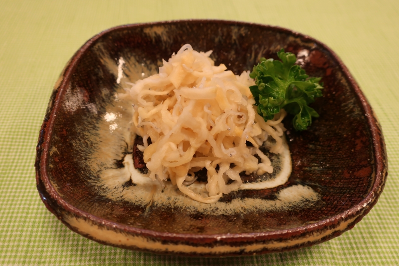 | 切り干し大根 | 20g | 1)切り干し大根はさっと洗い、しばらく水につけ軽く絞り、 食べやすい長さに切る。ちりめんじゃこは熱湯をかけ、水気をきる。 2)すし酢に水を加え、漬け汁を作る。 お好みで唐辛子やショウガを加えてもいいですよ! |