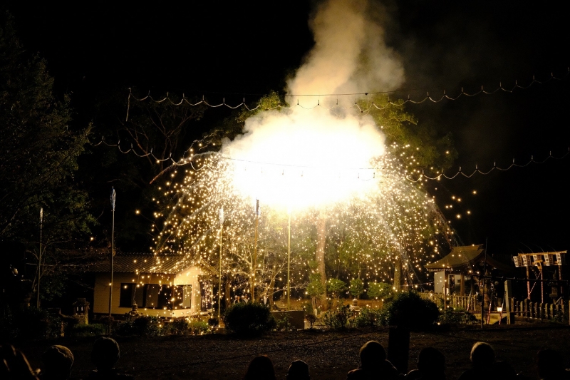 令和7年10月15日(水曜日)、玉名市築地にある四十九池神社で秋季大祭が行われます。この秋季大祭では、地元住民らが手作りした花火を境内で打ち上げられます。参道と鳥居を火玉が猛スピードで往復する「ねずみ火」で花火が始まり、竹製の矢「流星」や火花をまき散らす「傘火」など伝統的な花火6種が次々に空を舞います。また、三味線、笛、太鼓で構成される楽は、例大祭では12曲が演奏されます。