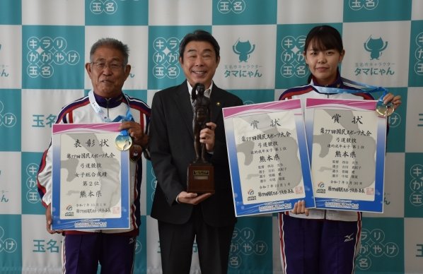 10月6日、玉名市弓道連盟に所属する西谷光生(にしたにこうせい)さん、中尾瑠夏(なかおるか)さんが市長を表敬訪問し、9月28日に滋賀県で開催された「国民スポーツ大会弓道競技」において、熊本県代表として成年女子の部に出場し、近的及び遠的の双方で優勝したこと報告しました。