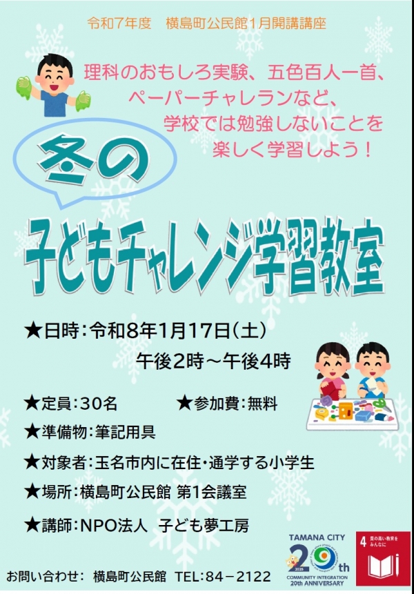 横島町公民館では「冬の子どもチャレンジ学習教室」を開講します。