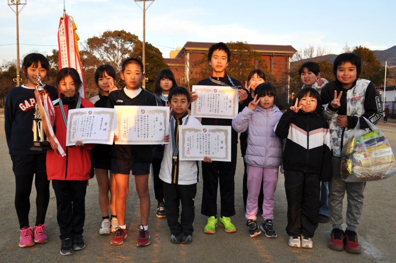 天水中学校グラウンドをスタート・ゴールとするコースを11チームの小学生がタスキをつないで一生懸命走りました。