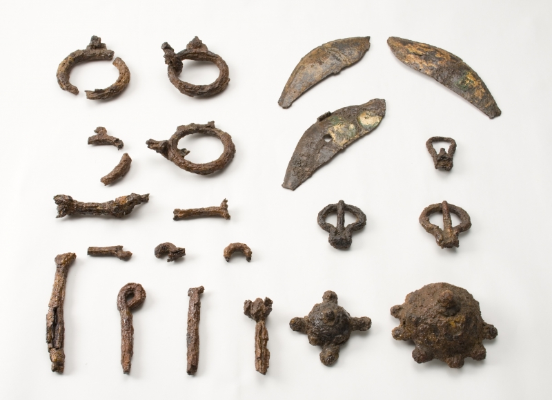 また、小路古墳からはガラス玉やヒスイ製まが玉、金メッキの耳環(じかん)などの装飾具、金メッキの鞍飾りや雲珠(うず)などの馬具、鉄鏃(てつぞく)や刀子(とうす)などの武具、が出土しています。