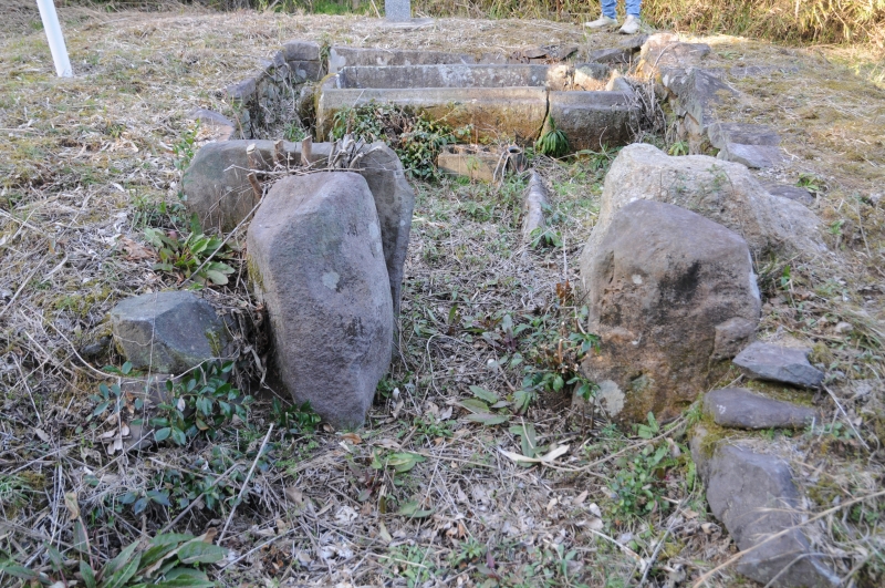 昭和41年、山砂採取工事に伴い発見されたため、急遽、玉名高校考古学部により発掘調査が行われました。天井部は消滅していましたが、単室の横穴式石室で奥死床(おくししょう)に舟形石棺があり、通路の左右にも死床があることがわかりました。玄室(げんしつ)は、安山岩の割石(わりいし)を小口積みにし、羨門(せんもん)には花崗岩を使用しています。石棺は全長2m、幅約1mで蓋は切妻の家形でした。石棺の年代は、6世紀初頭と考えられ、舟形石棺としては玉名市内で最終段階となります。それまで古墳に直葬されていた石棺は、横穴式石室の中に置かれ、その後、石屋形(いしやかた)へと変化していきます。