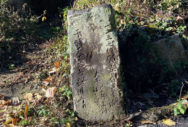 玉名市石貫字清水と字馬場の境界を流れる繁根木川支流の馬場川に橋長・橋高3メートル、幅3.5メートルのコンクリート橋(玉名市道柴尾口・広福寺線)が架かっています。橋左岸下流側の市道片隅に石碑が建っており、碑は地上部高80センチ、碑の正面幅30センチ、横幅27センチの角柱(凝灰岩)で正面に刻銘があり、この刻銘によって天正3年(1575)に馬場川に橋が架けられたことが判る資料です。