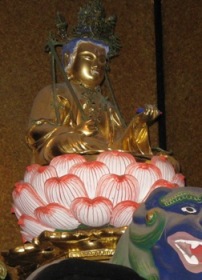 左脇侍文殊菩薩とほとんど同形同大です。右手は右足につけ、左手はやや上向きにして長い蓮の茎を左斜め上に、両手で持つ。白象の上に結跏趺坐する。本尊と一具とみられます。
