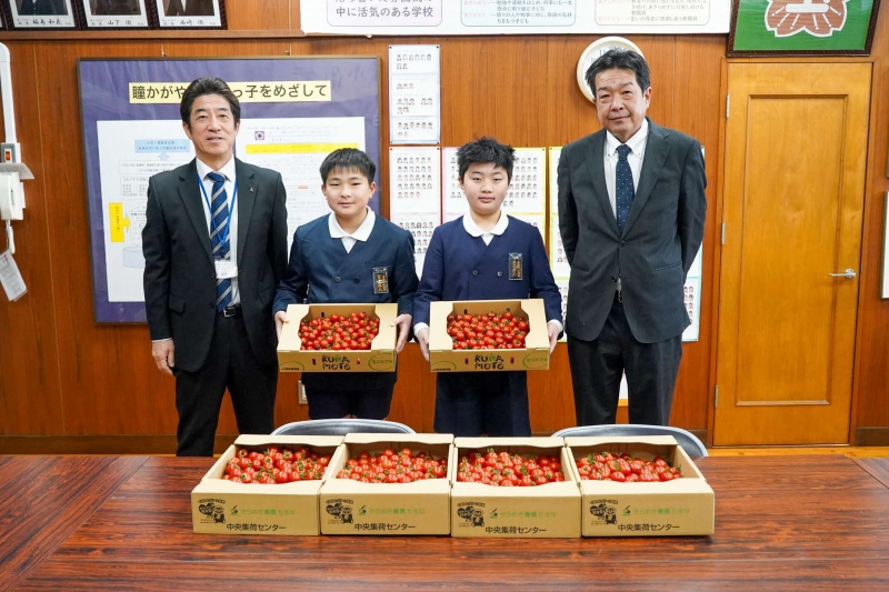玉名市野菜振興協議会(玉名市・JAたまな・JA大浜)が地産地消を目的として、市内小中学校給食用に旬の玉名産のイチゴ 10,680個、丸トマト 8キログラム、ミニトマト 3,430個、ミディトマト 6,540個を提供しました。