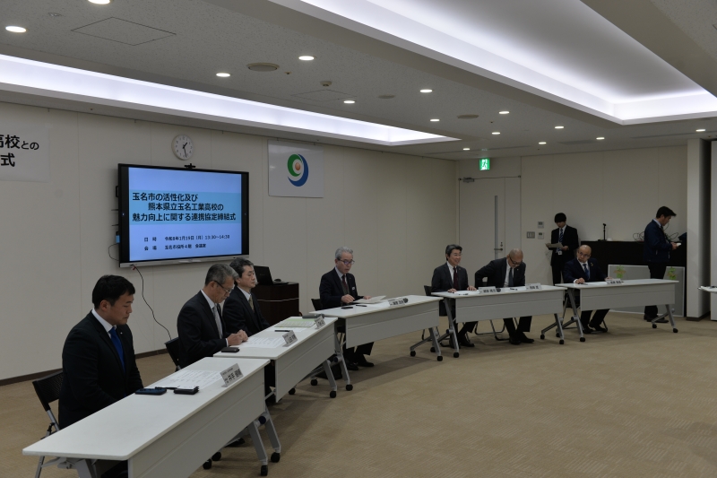 1月19日、玉名市(市長:藏原隆浩)、玉名商工会議所(会頭:山田邦男)、玉名市商工会(会長:池田武)、株式会社肥後銀行(玉名支店長:後藤康雄)、(一社)玉名青年会議所(理事長:塩山治彦)と熊本県立玉名工業高校(校長:西村和久)が「玉名市の活性化及び熊本県立玉名工業高等学校の魅力向上に関する連携協定」を締結しました。