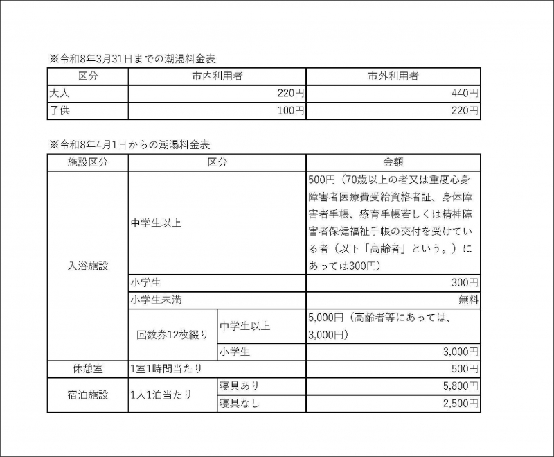 いつも潮湯をご利用いただき誠にありがとうございます。昨今の物価上昇による光熱費、人件費、設備費等の値上がりから、令和8年4月1日(水)よりご潮湯の利用料金を改定させていただくこととなりました。ご理解のほどよろしくお願い申し上げます。