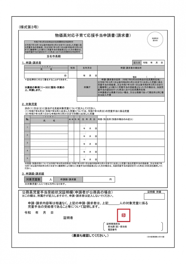 公務員の人は応援手当の申請書の提出が必要です。公務員にかかる申請書については、所属庁(勤務先)から支給対象となる公務員に児童手当の受給証明付き申請書が配付されます。令和7年9月30日時点における住所地の市町村へ提出してください。