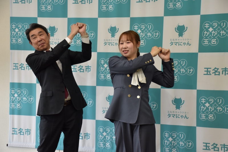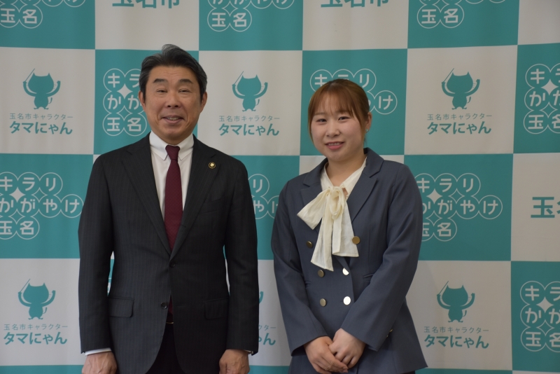市長は「玉名市出身の方がこのように活躍されることは大変うれしく思います。玉名市民皆さんが喜んでいます。日ごろからの練習の積み重ねだと思います。プロとして1年間努力され素晴らしい成績を残されました。ぜひ全米目指してこれからも活躍されることを期待しております。」と激励しました。