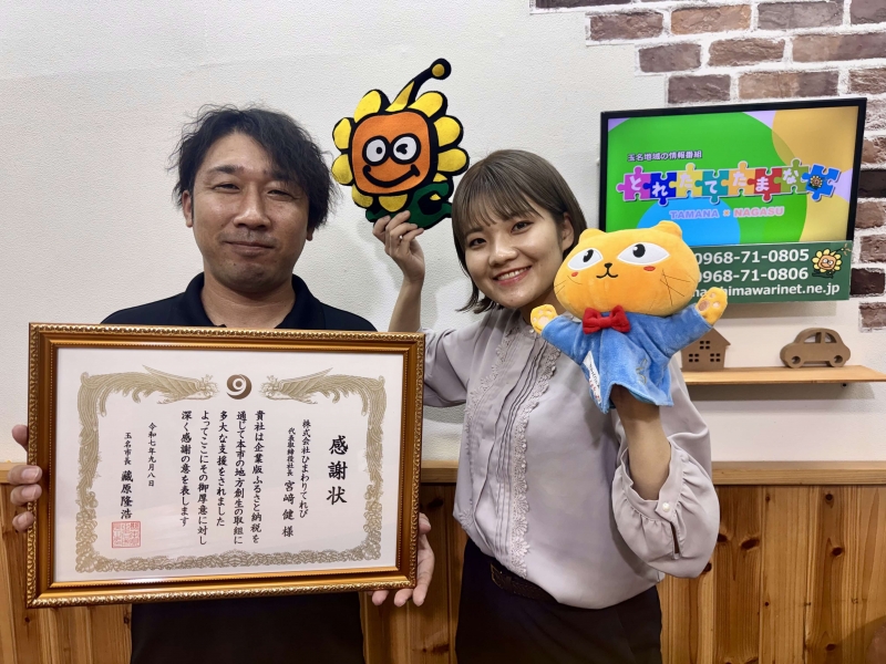 株式会社ひまわりてれび 専務取締役 宮崎様から目録が贈呈され、藏原市長から感謝状を贈呈しました。